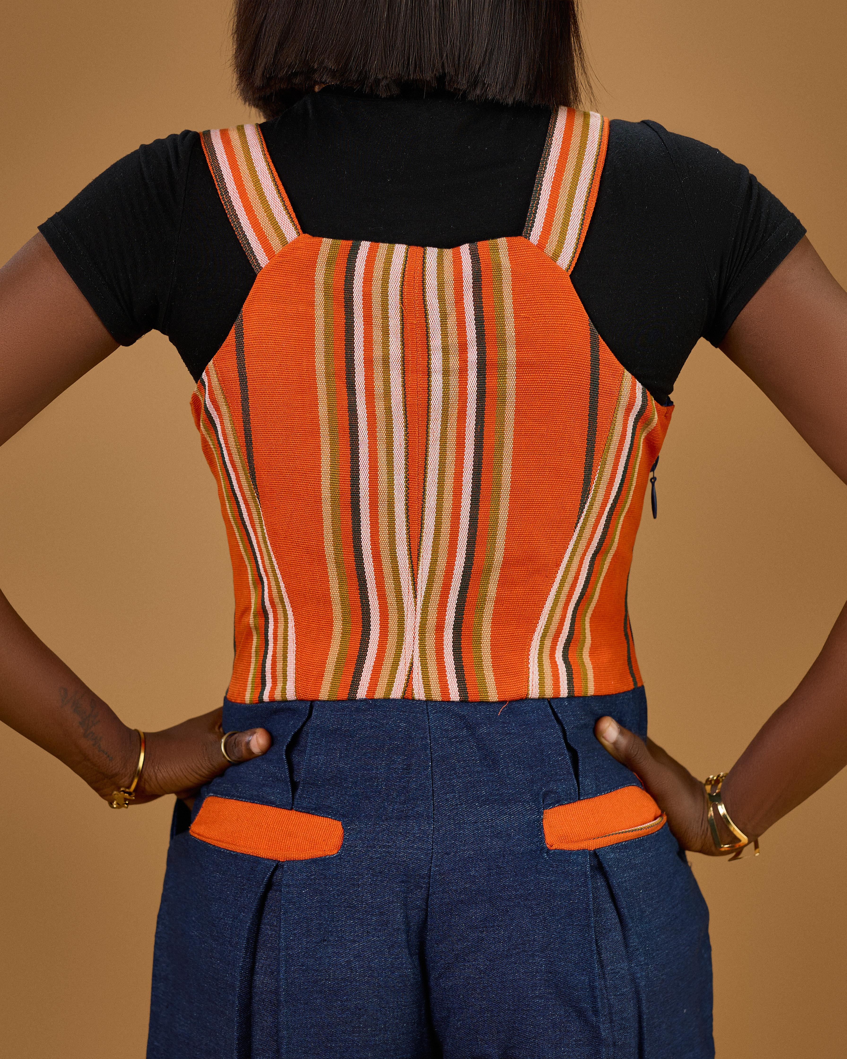 The warm orange stripes of aso oke bring vibrancy and cultural pride, while the denim base grounds the design in modern practicality. With its structured silhouette and functional detailing, the Iseyin Piece is made for those who want to carry heritage with them, every day.